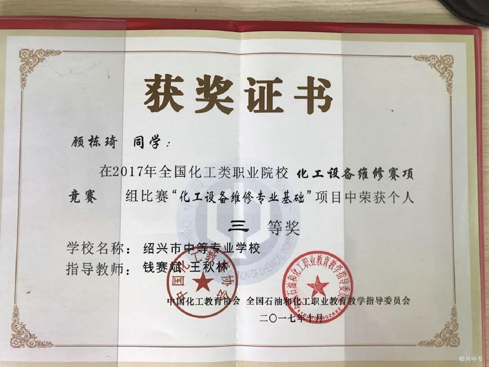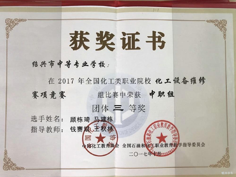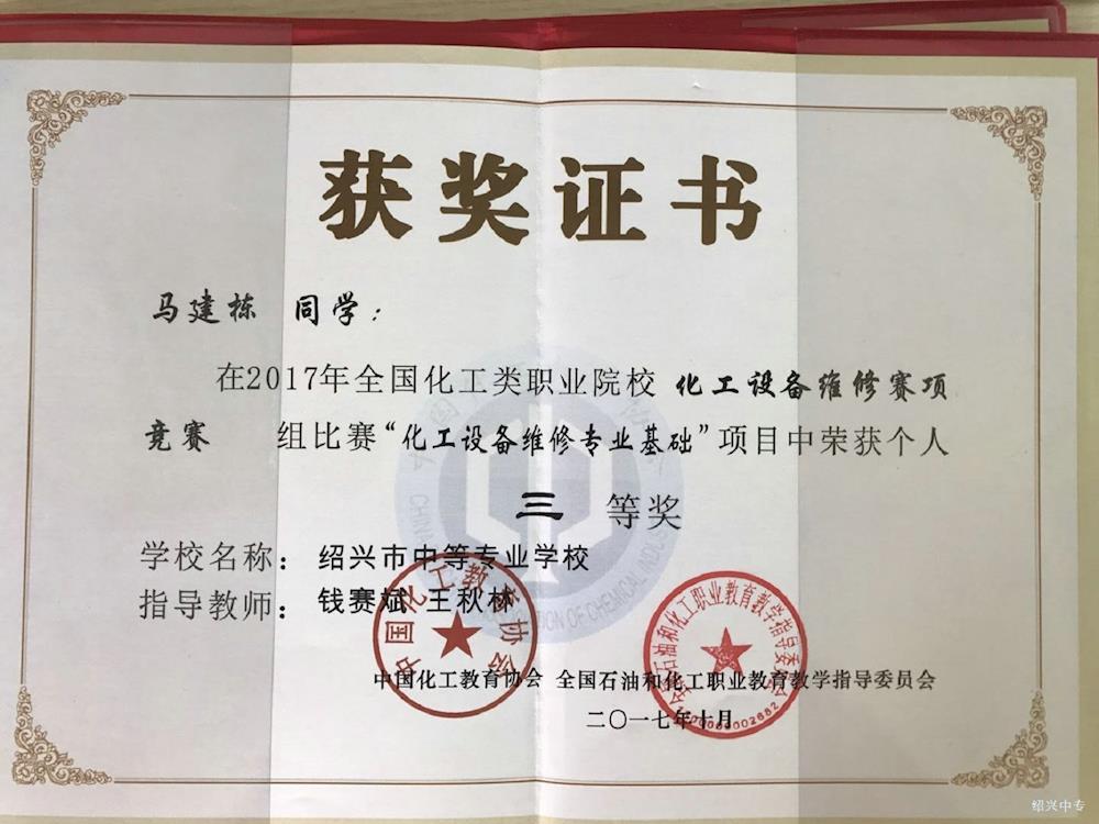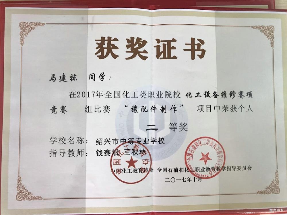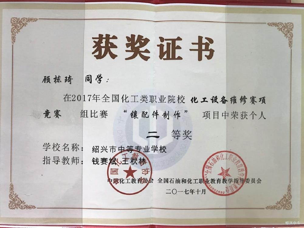 10 月25日,江苏南京“2017年全国化工类职业院校化工设备维修赛项竞赛”赛场传来喜讯,由杭建卫老师领队, 王秋林、钱赛斌老师指导,顾栋琦、马建栋参赛的 绍兴中专代表队在此次竞赛中摘得五个奖项, 顾栋琦、马建栋都获得“镶配件制作”项目与“化工设备维修专业基础”项目个人二等奖与三等奖,开云官方注册取得中职组团体三等奖。